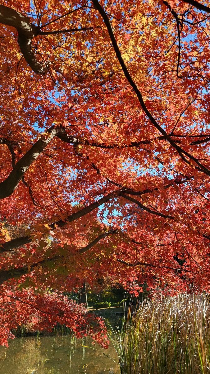 There's a Japanese maple tree near the water.